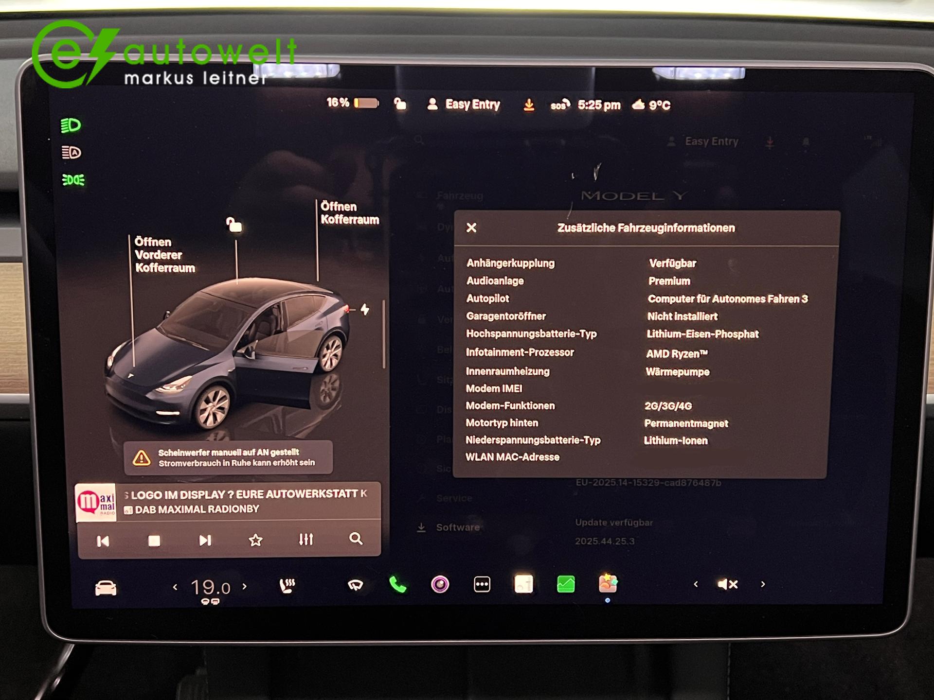 Zusätzlich verfügt das e-Auto noch über folgende Ausstattungsmerkmale:19" FelgenAudio und MedienAudiosystem – 7 LautsprecherMusik & Medien über Bluetooth®USB-A Anschluss im HandschuhfachKomfortVordersitze mit elektrischer Verstellung und SitzheizungGetöntes Glasdach mit UV- und Infrarot-SchutzschichtInnenraum-BodenmattenDoppelverglasung der SeitenscheibenExtrasElektrisch einklappbare, beheizte Außenspiegel mit AbblendautomatikIndividuelle FahrerprofileMittelkonsole mit Staufächern, 4 USB-Anschlüssen und kabellosem Ladedock für 2 Mobiltelefoneelektrische HeckklappeLED-Nebelscheinwerfer